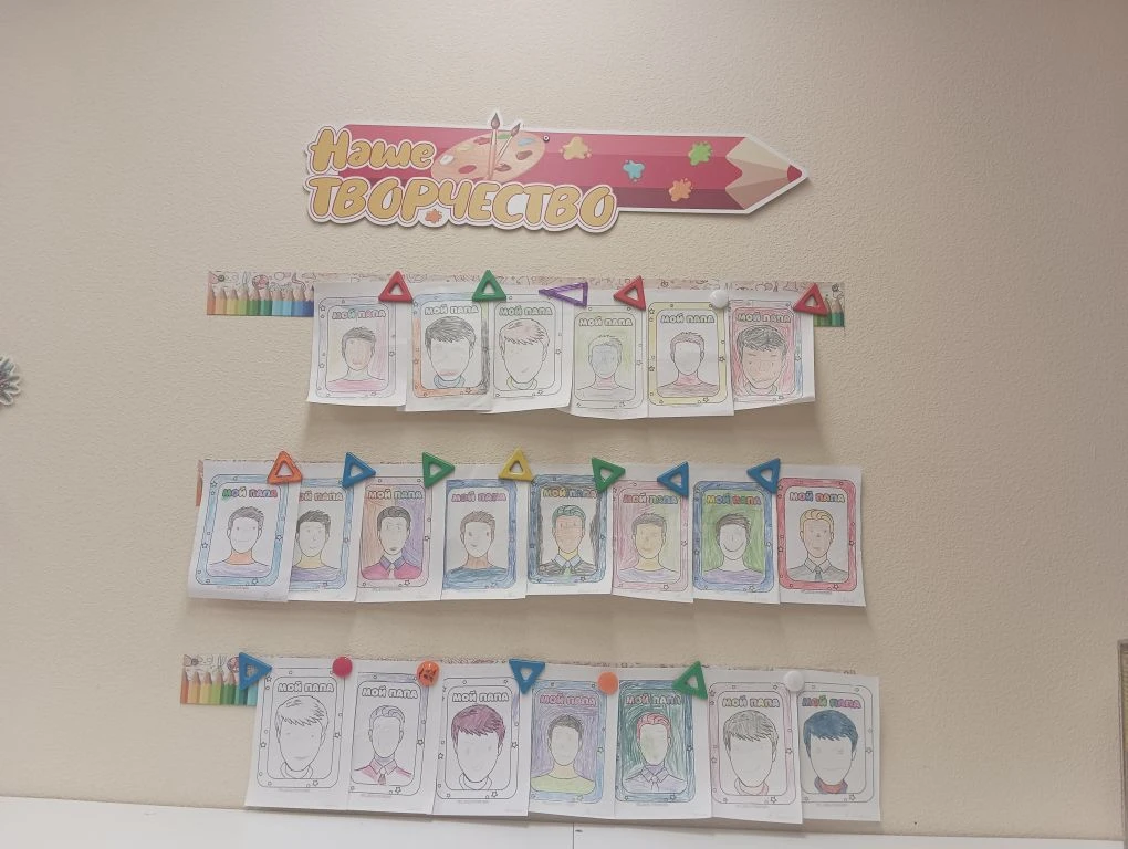Выставка детско-родительского творчества «Наши замечательные папы». Дети и родители с радостью рассматривали рисунки. Каждый ребенок с гордостью находил рисунок папы и говорил, что он самый смелый, самый лучший.